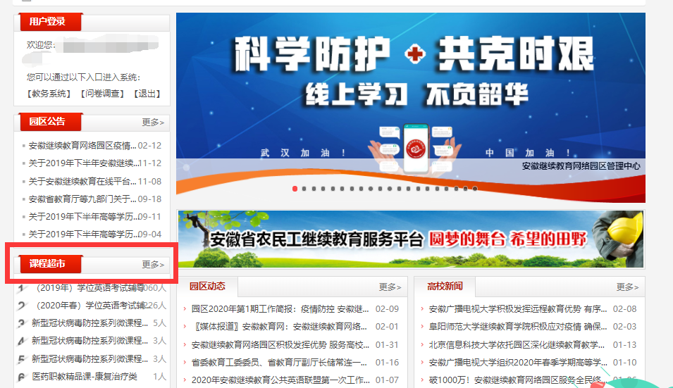 第一步:打开“安徽继续教育在线官方网站”:(/demo/upload/files/2021/2/30fc7315549592e8.cn),已导入园区平台在校生请使用学习账号登陆,非在校生请按照要求注册后登陆。