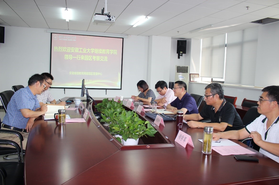 9月10日下午,安徽工业大学继续教育学院院长岳朝龙,副院长俞惠平、赵文清等一行五人来园区考察交流。园区管理中心负责人热情接待了来访客人,双方就资源共建共享、线上线下教学模式改革、函授站的管理、安徽继续教育公共英语联盟及线上教学质量考核等事宜进行了深入交流。