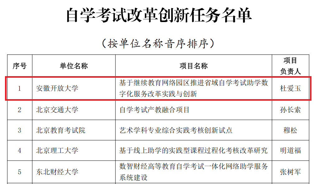 近日,教育部公布了2024年学习型社会建设重点任务(高等继续教育领域)培育建设名单,由安徽开放大学牵头申报的《基于继续教育网络园区推进省域自学考试助学数字化服务改革实践与创新》项目从全国956个项目中脱颖而出,获批立项2024年学习型社会建设重点任务,成功入选全国32个“自学考试改革创新任务”。该项目由安徽开放大学联合合肥工业大学、安徽师范大学、安徽财经大学、安徽工程大学共同申报,系全国开放大学办学体系、安徽高校在该领域唯一获批项目。