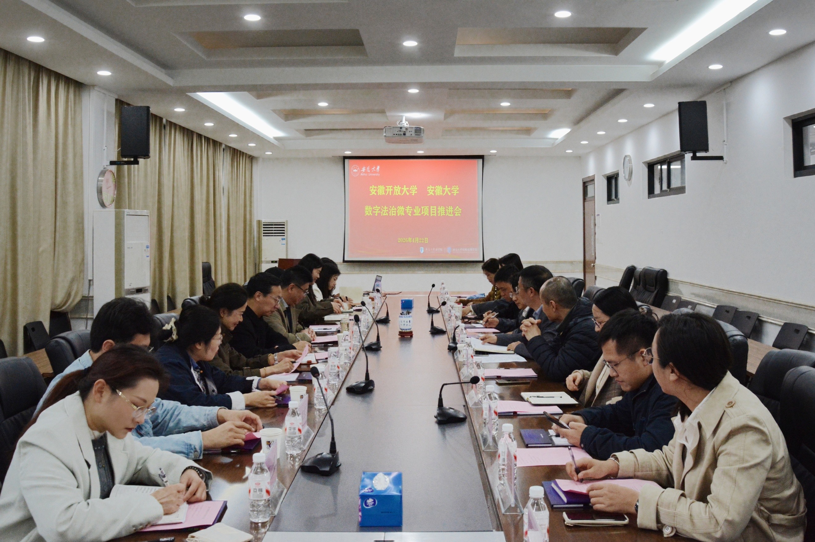 4月22日下午,安徽大学与安徽开放大学数字法治微专业共建项目推进会在安徽大学磬苑校区法学院召开。安徽大学法学院(纪检监察学院)党委书记毕金平、副院长孔令勇、数字法治微专业负责人李胜利教授,继续教育学院院长周伟斌、副院长蔡丽丽,安徽继续教育网络园区管理中心、安徽省终身教育学分银行管理中心、安徽开放大学继续教育学院、文法与教育学院、学习资源中心负责人及双方相关教师代表共计20余人参会。