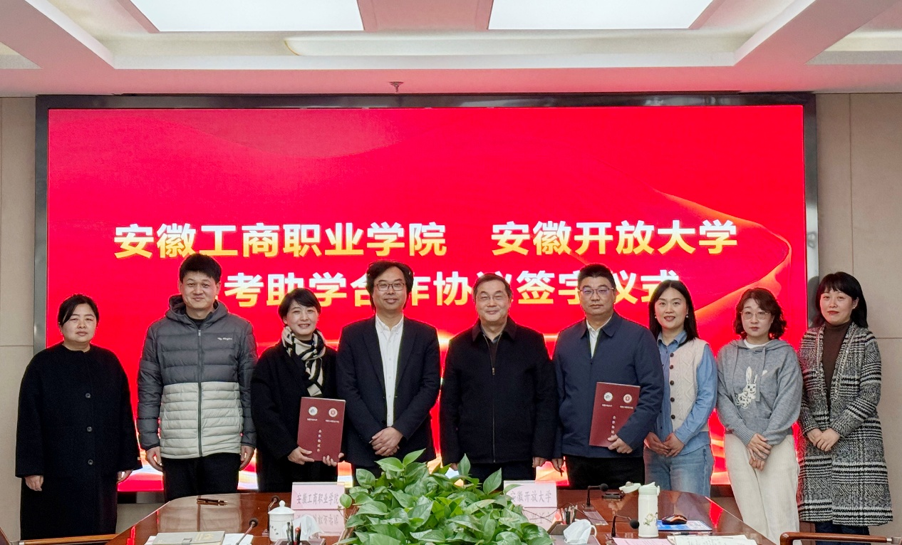 12月15日下午,安徽开放大学与安徽工商职业学院举行自考助学合作协议签字仪式。安徽工商职业学院党委委员、党委宣传统战部部长孔成,安徽开放大学党委委员、副校长诸咸斌出席,安徽继续教育网络园区管理中心、安徽省终身教育学分银行管理中心、安徽工商职业学院国际交流与继续教育学院、安徽开放大学自考助学服务中心等有关部门负责人及相关人员参加签字仪式及交流活动。