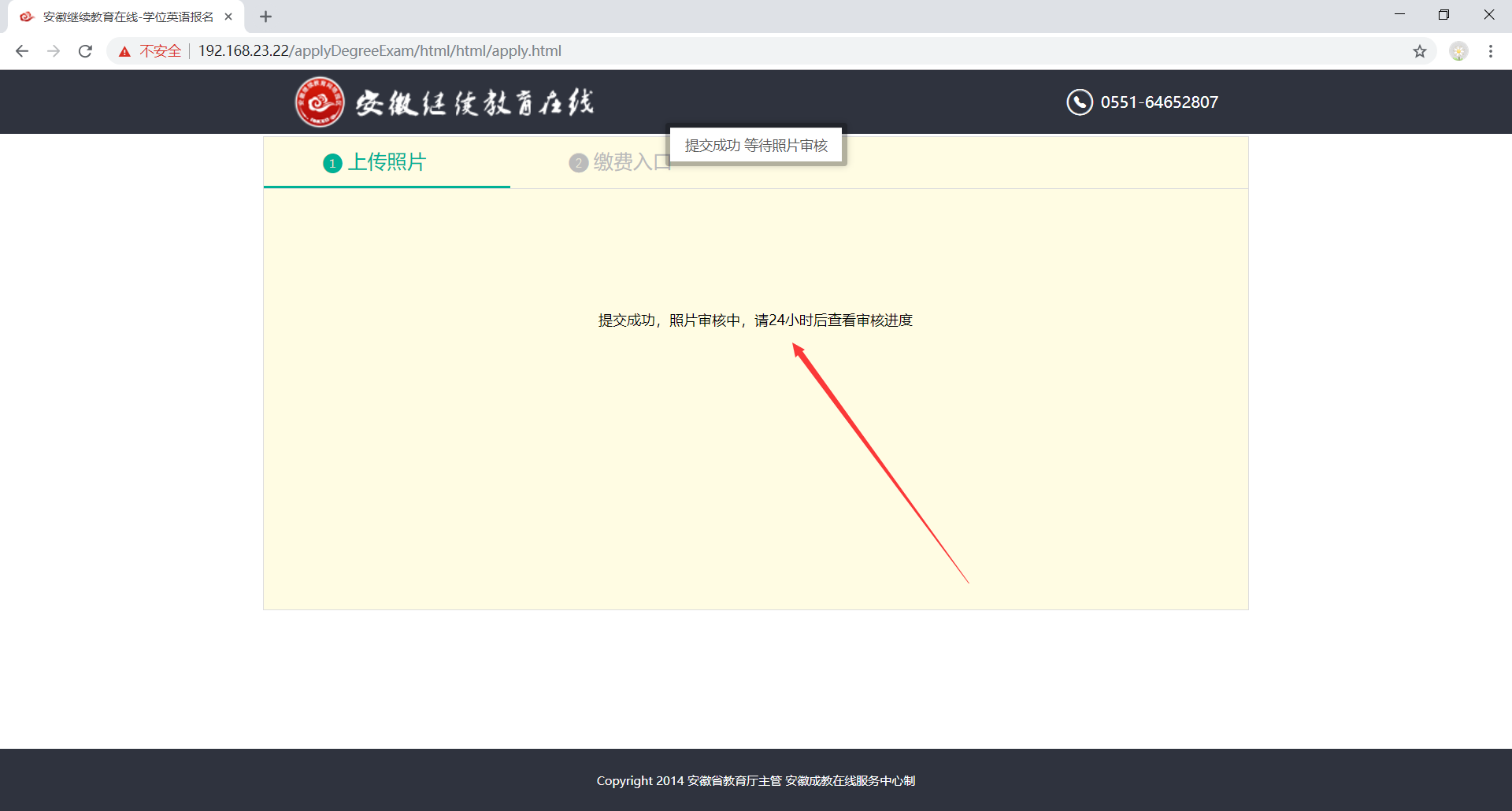 4. 提交照片信息后等待学位英语管理员审核照片(审核时间一般不超过24小时,审核通过后就可以报名缴费了),如果没有审核通过需要重新提交本人照片再次进行审核。
