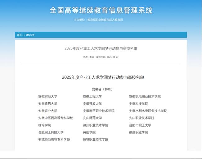 >> 安徽建筑大学入选教育部2025年度产业工人求学圆梦行动