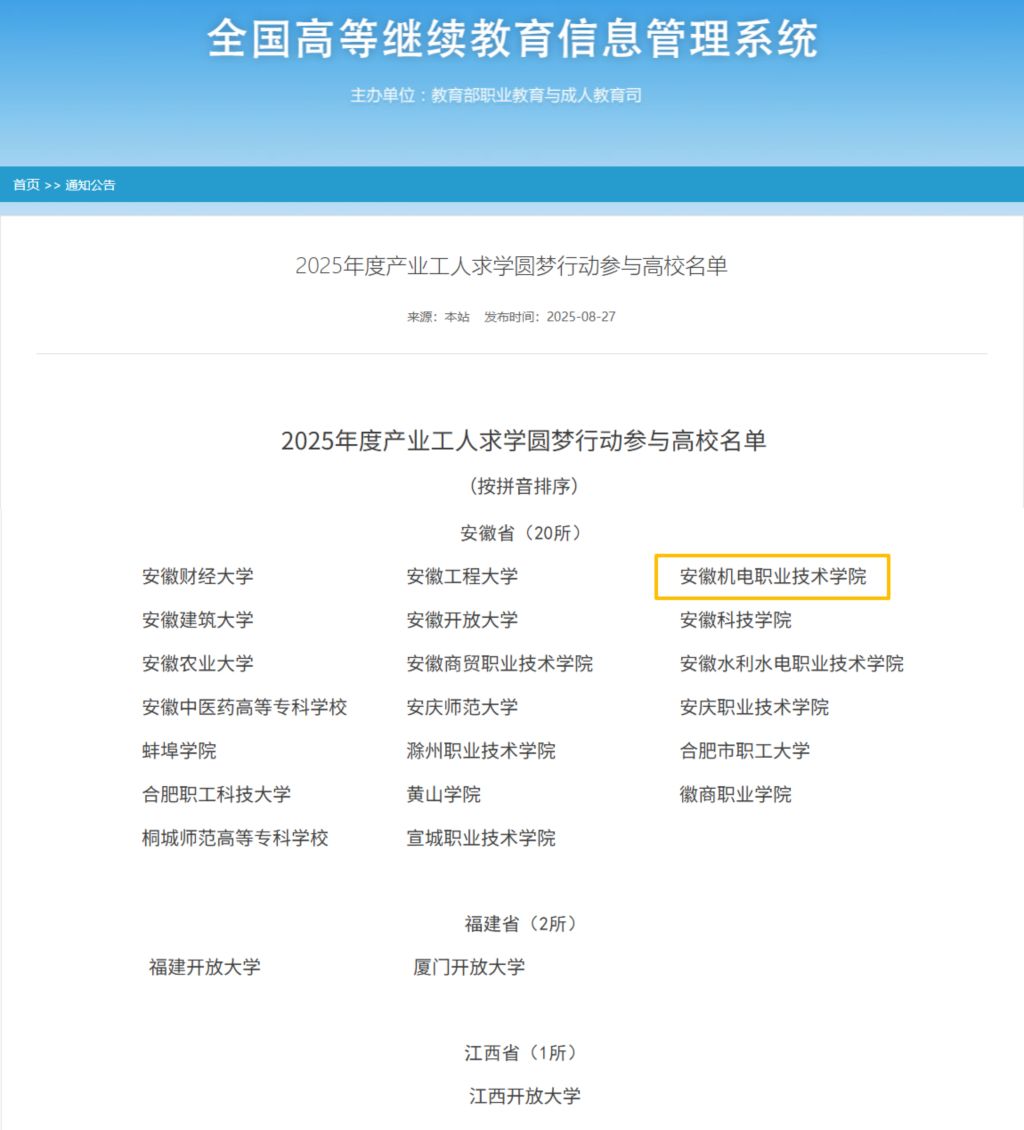>> 安徽机电职业技术学院:【机电荣耀】我校成功入选2025年度产业工人“求学圆梦行动”参与高校