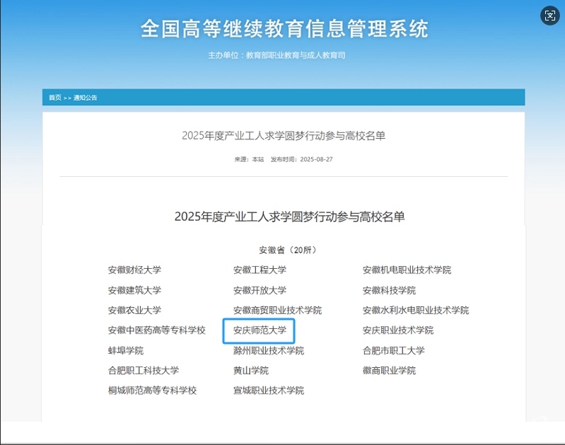 近日,教育部公布了2025年度产业工人求学圆梦行动参与高校名单,经学校自主申报、安徽省教育厅遴选推荐、教育部专家评审等程序,我校成功入选。这标志着我校在服务国家重大战略、深化产业工人队伍建设改革方面迈出了坚实步伐。