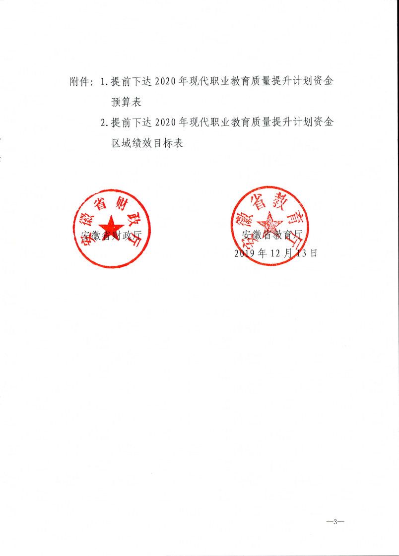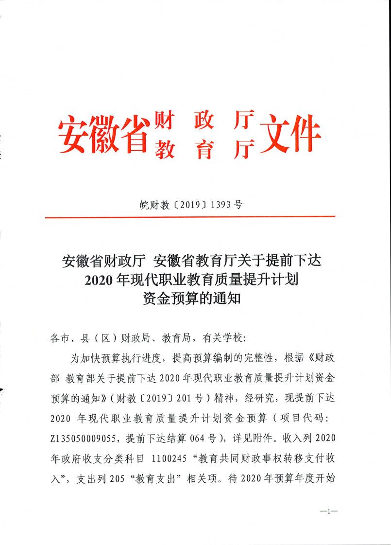 安徽省财政厅安徽省教育厅关于提前下达2020年现代职业教育质量提升计划资金预算的通知
